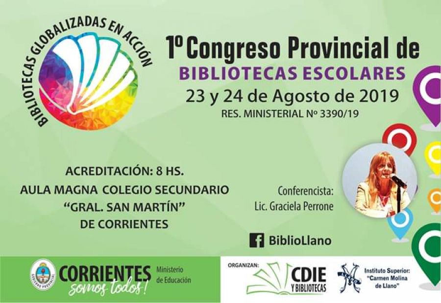 El Gobierno de la Provincia a través del Ministerio de Educación en conjunto con el Centro de Documentación e Información Educativa y Bibliotecas (CDIE), en articulación con la carrera de Bibliotecología del Instituto Superior “Carmen Molina del Llano” dependiente de la Dirección de Nivel Superior, realizará el Primer Congreso Provincial de Bibliotecas Escolares “Bibliotecas globalizadas en Acción" los días 23 y 24 de agosto en el Aula Magna del Colegio Secundario "Gral. San Martín".