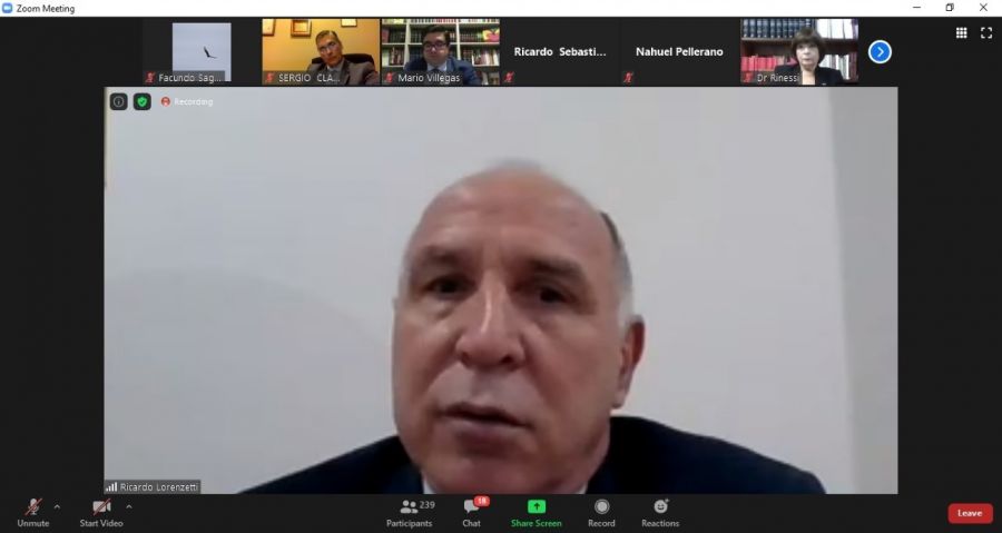 El juez de la Corte, ex presidente del tribunal, habló por más de cuarenta minutos sobre cómo debe interpretarse desde el Derecho al impacto económico, a la digitalización masiva y a los nuevos términos en los contratos que causó la pandemia de coronavirus, no obstante, decidió cerrar su charla con una reflexión profunda sobre la responsabilidad de la acción en torno al vínculo que es necesario destacar entre la salud humana y la salud de la naturaleza.