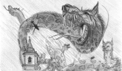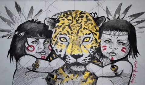 Foto: El Pombero y El Tigre del Paraná, por Eugenio Led. Ilustración 21x29,7 cm.