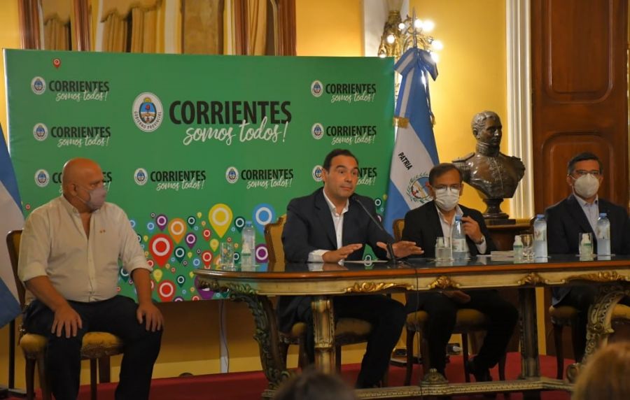 El gobernador habló hoy en conferencia de prensa en el Salón Amarillo de la Casa de Gobierno de Corrientes junto a ministro Secretario General de la Gobernación, Carlos Vignolo, y al ministro de Salud de la Provincia, Ricardo Cardozo, luego de oír un balance de la situación epidemiológica de la Provincia, que en la jornada ha registrado un pico record de 663 contagios de coronavirus.