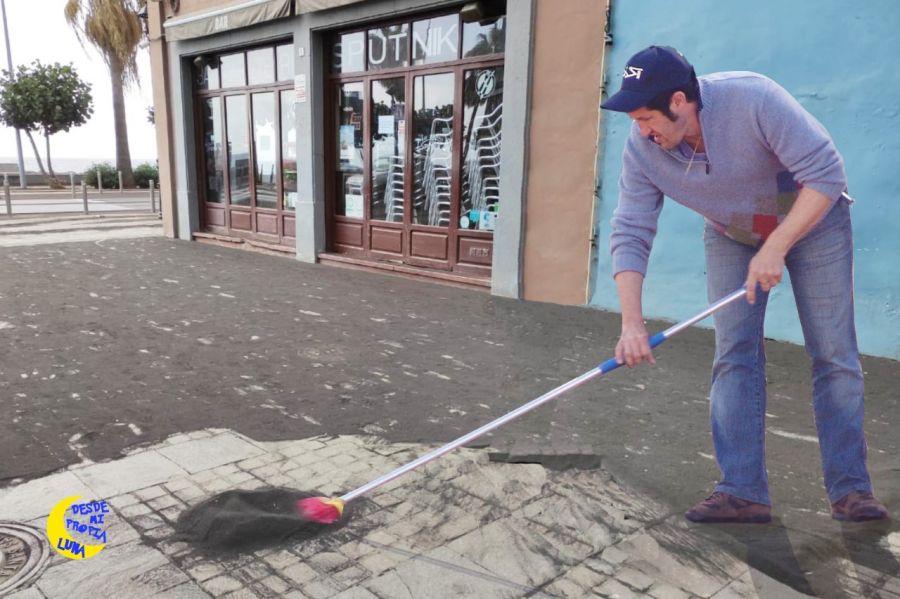Otra amiga, con la que también pude coincidir en algún rodaje al comienzo de mi carrera y que vive en la isla La Palma, me contaba por teléfono la misma problemática y le prometí hablar de las verdaderas necesidades de los afectados por el volcán. Y aquí cumplo, como siempre. Me resultó especialmente significativo que hiciera mucho hincapié en el problema que, en ese momento, era más acuciante: las cenizas del volcán. Ya no me hablaba tanto de la lava, ni de los gases tóxicos, ni de si iba o no iba a llegar al mar y sus efectos. Me relataba del desánimo de la población del resto de la isla que ya empezaba a desmoronarse anímicamente por tener que estar, varias veces al día, limpiando la ceniza que caía sobre sus casas, sus campos, sus calles, sus alcantarillas taponándolas, sus colegios, sus vidas. Pero lo peor es que estas partículas de polvo emanadas del cráter, mezcladas con el agua de la lluvia, ya no se dejarían barrer, ahora habría que romperlas. Y no hay manos para tanto trabajo.