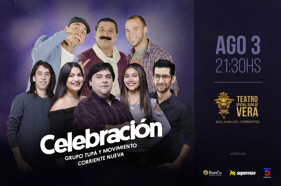 Celebración será el espectáculo en el que Tupá, conformado por Aldy Balestra, Carlos Escobar y Gabriel Bartolucci, así como los chicos de Movimiento Corriente Nueva, Pedro Ríos, Sofía Morales, Sergio Sosa, Julieta y Luciano Obregón, estarán juntos sobre las tablas del Vera. “Con Celebración, vamos a estar ante el comienzo de muchas cosas”, dijo Aldy Balestra, fundador de Tupá y quien dio origen al Movimiento.