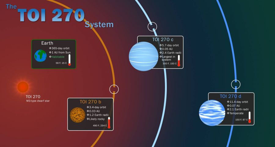 Los otros dos planetas, TOI 270 c y d, son, respectivamente, 2,4 y 2,1 veces más grandes que la Tierra y orbitan la estrella cada 5,7 y 11,4 días. Ambos pueden ser similares a Neptuno en nuestro sistema solar, con composiciones dominadas por gases en lugar de rocas, y probablemente pesan alrededor de 7 y 5 veces la masa de la Tierra, respectivamente.