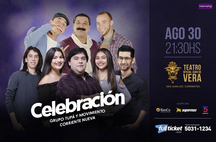 Celebración será el espectáculo en el que Tupá, conformado por Aldy Balestra, Carlos Escobar y Gabriel Bartolucci, así como los chicos de Movimiento Corriente Nueva, Pedro Ríos, Sofía Morales, Sergio Sosa, Julieta y Luciano Obregón, estarán juntos sobre las tablas del Vera. Será en el marco del show “Celebración”, el próximo viernes 30 de agosto a las 21.30.