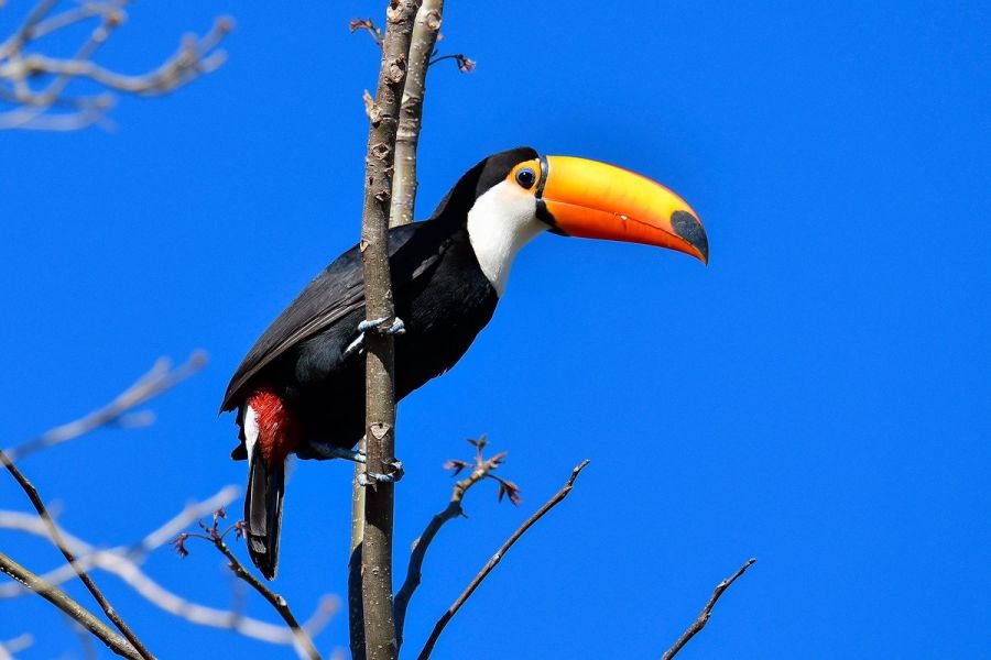 1 - Tucán grande (Rhamphastos toco): tiene la mayor distribución en nuestro país. Se lo puede observar tanto en la selva misionera como en el bosque chaqueño y en las yungas. Su colorido pico anaranjado, contrastando con su cuerpo negro y blanco lo hacen inconfundible. Es grande, mide unos 55 cm y es un avistaje asegurado en el Parque Nacional Iguazú. Merodea las colonias de los boyeros, que construyen nidos colgantes pero que para los tucanes no es un impedimento escudriñar su interior con su pico largo y curvo.