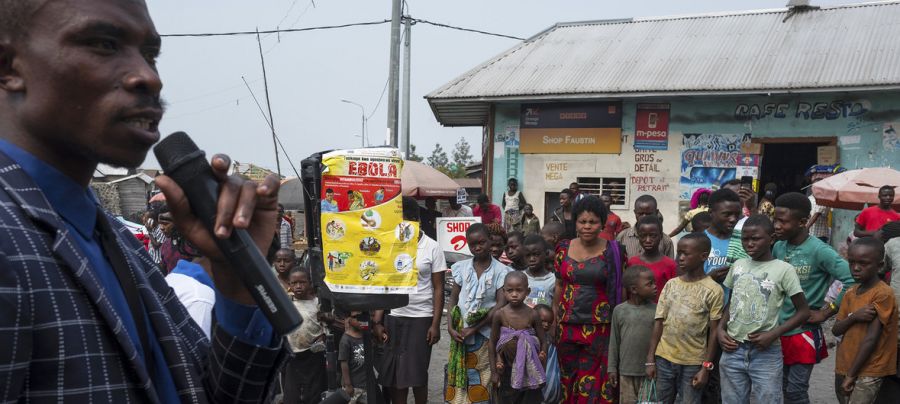Foto: Un miembro del equipo de participación comunitaria que advierte sobre los peligros del ébola responde a preguntas sobre el actual brote de la enfermedad en Goma, en la provincia de Kivu del Norte, en el este de la República Democrática del Congo. (Agosto de 2019)