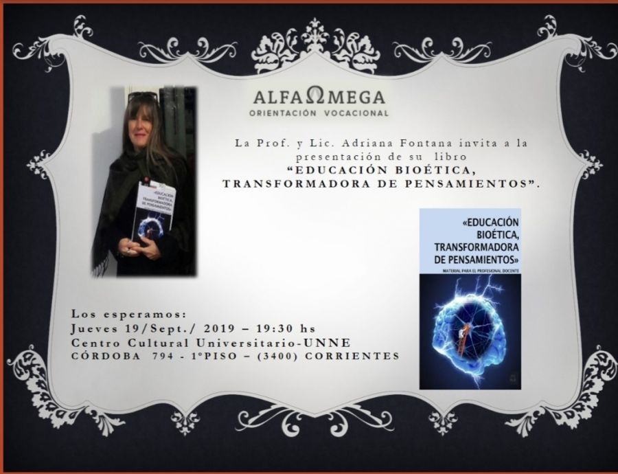 La profesora y licenciada Adriana Elisabet Fontana presentará su segundo libro “Educación bioética, transformadora de pensamientos”. Será el próximo jueves 19 de septiembre en el Centro Cultural Universitario a partir de las 19y30
