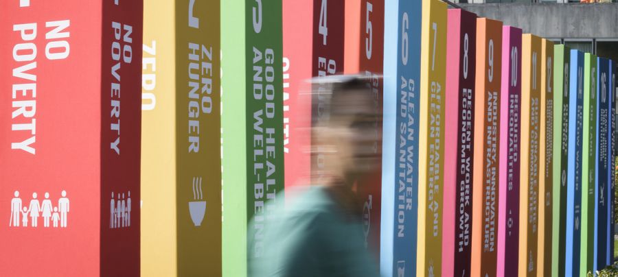 Foto: Expositores promocionales que ilustran los 17 Objetivos de Desarrollo Sostenible en la Sede de las Naciones Unidas en Nueva York.