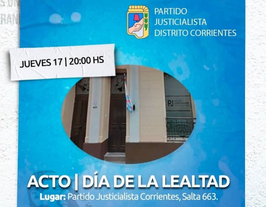 Cabe destacar que el acto formal por el día de la lealtad se realizará este jueves 17 de octubre a las 20 en la sede partidaria, y contará con la presencia del jefe del bloque de diputados nacionales del PJ - FPV Agustín Rossi, junto a los candidatos a diputados nacionales del Frente de TODOS Corrientes José "Pitín Aragón", Nancy Sand, Fabián Borda y Nancy Esteche.