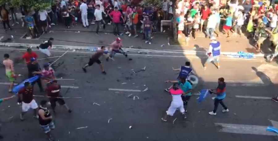 Los protagonistas de la pelea se enfrentaron con los palos de las banderas como lanzas, piedras y trompadas, por lo que los comercios ubicados en inmediaciones de la plaza Independencia debieron cerrar sus puertas.