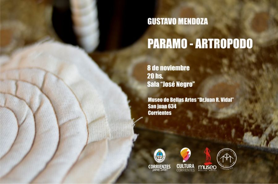 El artista visual Gustavo Mendoza inaugurará, este viernes 8 de noviembre a las 20, Páramo-Artópodo, en la Sala "José Negro" del Museo Provincial de Bellas Artes Dr. Juan Ramón Vidal, San Juan 634, Ciudad de Corrientes.