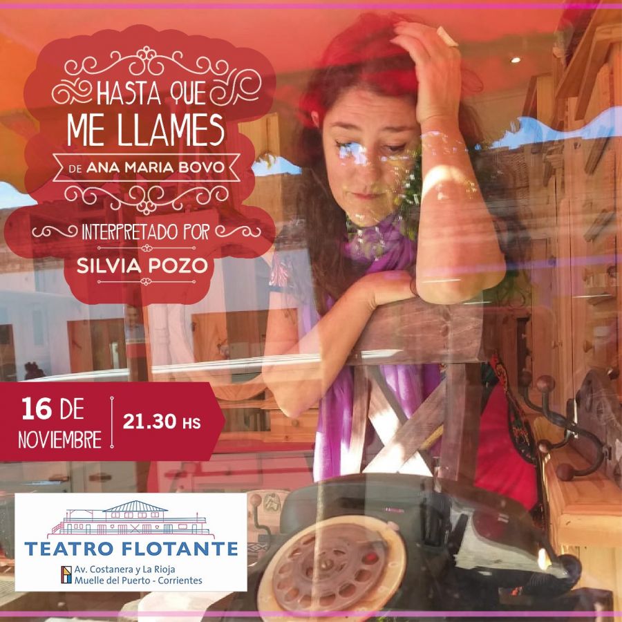 Será en el Centro Cultural Flotante el sábado 16 de noviembre a las 21y30. “Hasta que me llames” gira sobre la espera amorosa de un llamado telefónico. Para disipar esa intensa y angustiosa espera, se narran tres historias entrecruzadas: la de Ulises y Penélope de "La Odisea", la de Leocadia de la película "La flor de mi secreto" de Almodóvar y una historia personal de la autora.