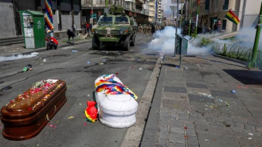La policía de Bolivia ha reprimido el jueves con gases lacrimógenos una multitudinaria marcha que llegaba a La Paz desde El Alto, acompañando los ataúdes de cinco de las ocho personas que murieron el pasado martes en la planta de acopio de gasolina y gas de Senkata, en las afueras de esta última ciudad. “No respetan ni a los muertos”, se escuchaba entre los grupos de manifestantes que quedaron desperdigados por el centro de la capital boliviana tras la actuación policial.