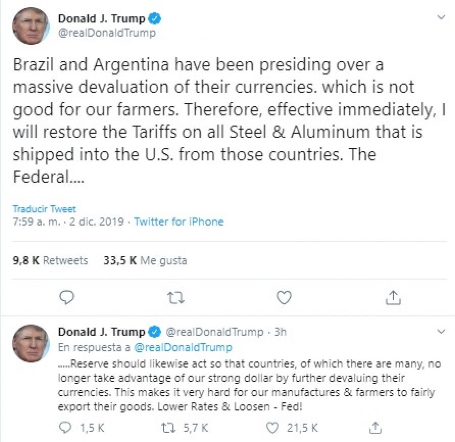 Ambos países "han presidido una masiva devaluación de sus monedas, lo que no es bueno para nuestros granjeros", apuntó el presidente de Estados Unidos