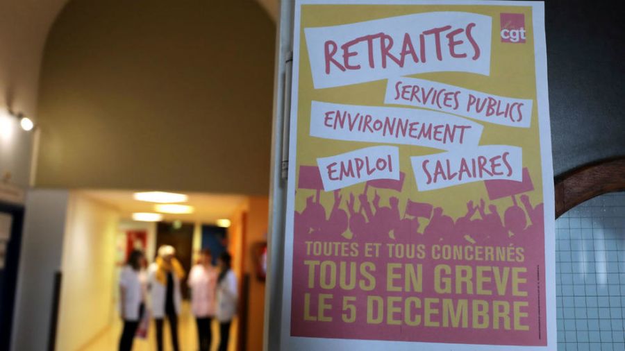 Foto: Un cartel que dice "Todos en huelga el 5 de diciembre" se ve en un pasillo del hospital