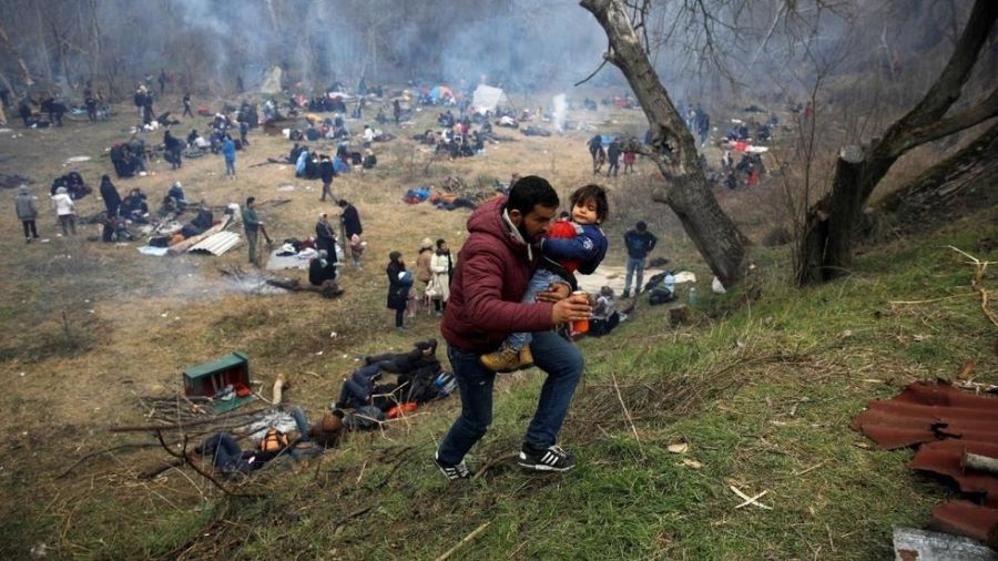 Foto: Un migrante lleva a un niño en el cruce fronterizo Pazarkule de Turquía con Kastanies de Grecia, en Edirne, Turquía, el 29 de febrero de 2020.