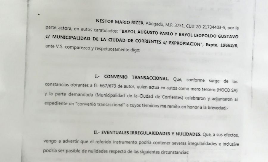Hace un año el escrito forma parte de la causa “Bayol C/ Municipalidad de la Ciudad de Corrientes S/ Expropiación”. Allí Néstor Ricer advierte a la jueza Varinia Machado Feris que el polémico “Convenio Transaccional” que firmaron (el 19 de enero de 2019) la Municipalidad (demandada por Bayol) y Hoco SA (tercero interesado) está plagado de “irregularidades y nulidades”; que el instrumento “afecta bienes y recursos públicos” y califica al convenio como “meras liberalidades” concedidas por el Municipio y a Hoco S.A.