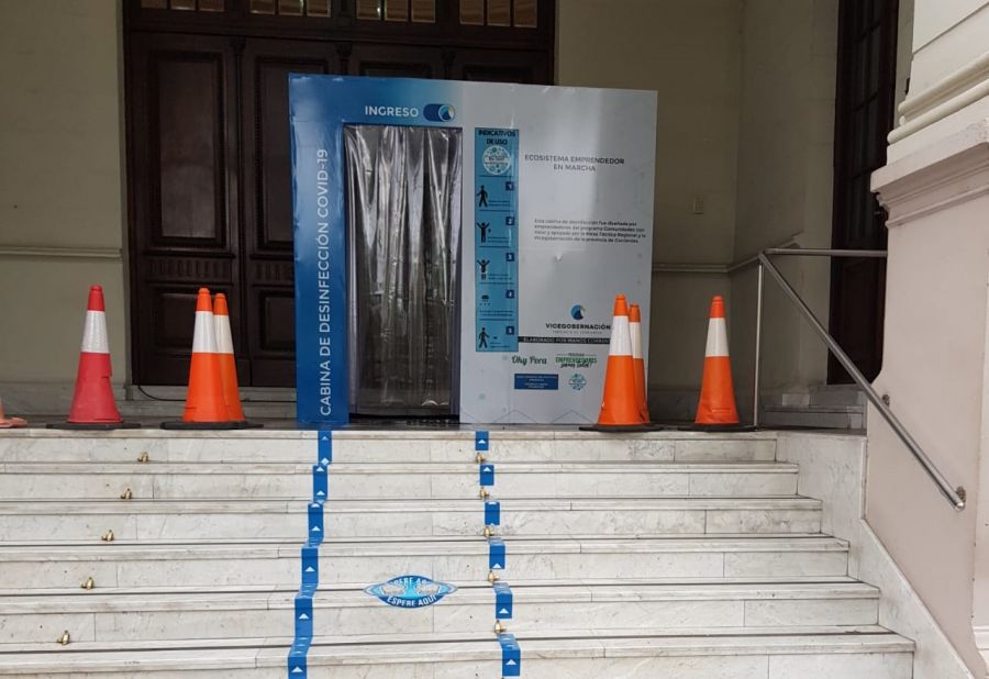 Para cumplir con las medidas sanitarias y de seguridad frente al Covid19 el vicegobernador Gustavo Canteros instalar una cabina de desinfección en el ingreso al Palacio Legislativo, para brindar mayor tranquilidad al personal y legisladores que están cumpliendo con sus tareas, en período de distanciamiento social.