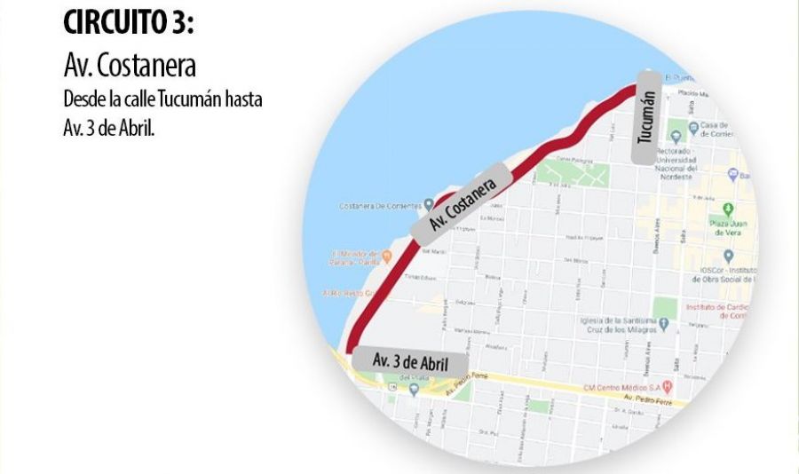 El circuito de la avenida Costanera comprenderá desde la calle Tucumán hasta avenida 3 de abril, y tendrá un cupo de hasta mil personas por turno. Por otra parte, el circuito del barrio Ex Aeroclub, abarcará entre las avenidas Sarmiento, Teniente Ibáñez, La Paz y Viedma; mientras que en la zona de avenida Libertad el recorrido será desde avenida N. Laprida hasta la Ruta Nacional (RN) Nº12, ambos con cupos para 200 cada uno y para cada turno.