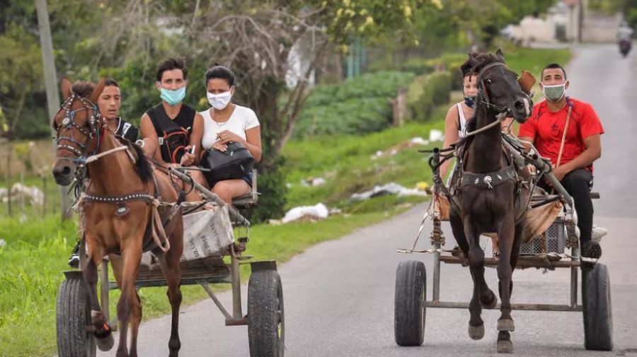 Foto: Personas con mascarillas en medio de la preocupación por la propagación del nuevo coronavirus, viajan en una carreta tirada por caballos en una calle de La Habana, el 2 de junio de 2020.