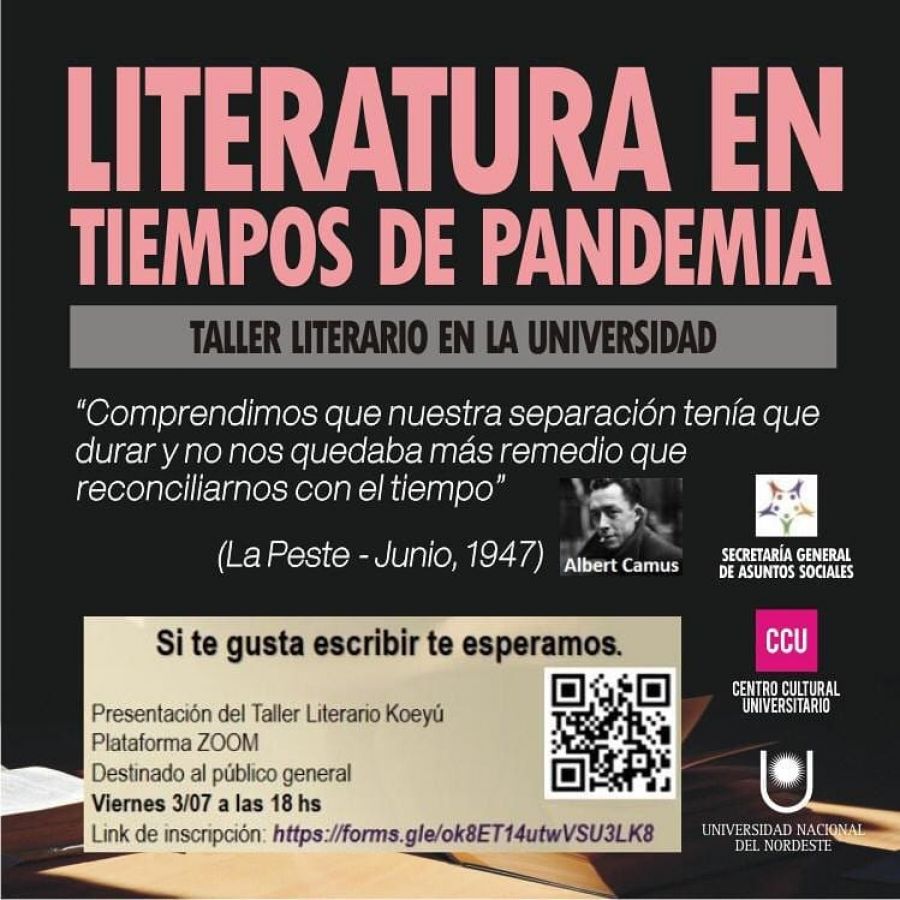El Taller Literario Koeyú va a participar realizando un ejercicio para todos los inscriptos además de que los participantes del taller podrán compartir sus escritos. El hilo conductor del taller será la novela “La Peste” de Albert Camus.