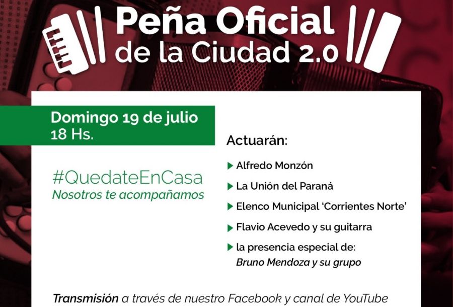 La Peña Oficial de la Ciudad 2.0 vuelve a ofrecer otro fin de semana cargado de propuestas chamameceras para los vecinos de la Ciudad y seguidores de las redes sociales de la Municipalidad para que puedan disfrutar de las actuaciones de destacados artistas de la música litoraleña.