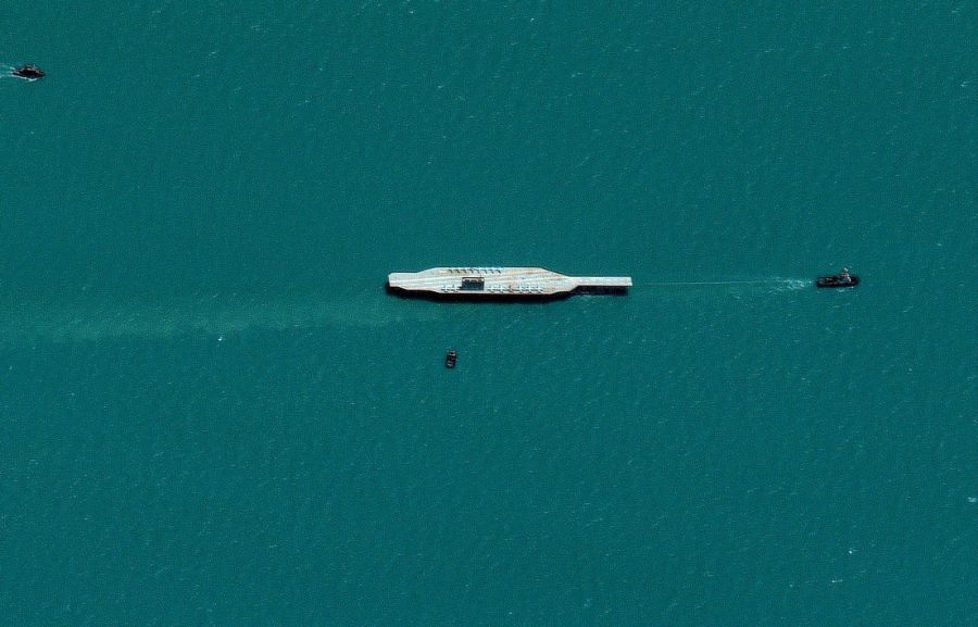 La maqueta de un portaaviones fue vista remolcada cerca de Bandar Abbas, Irán, 25 de julio de 2020.