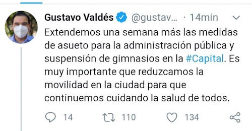 "Por eso es que estamos pidiendo movilidad, la menor posible. Estamos pidiendo que utilicen el tapabocas. Que haya un distanciamiento. Estamos pidiendo que se cuiden cuando viene una persona a nuestras casas, preferentemente que no ocurra, pero si viene utilicemos de igual forma el tapabocas. Si tenemos amigos y hablamos con amigos, por más de que sean nuestros amigos, que nos cuidemos", dijo Valdés.