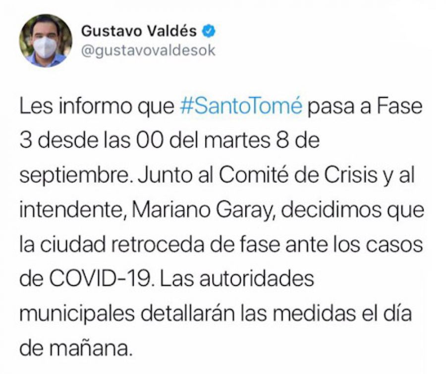 El gobernador Gustavo Valdés ha informado esta tarde que San tomé vuelve a fase 3 de cuarentena luego de trescasos de Covid19. En apralelo se activa protocolo en Estación Pedro Fernández