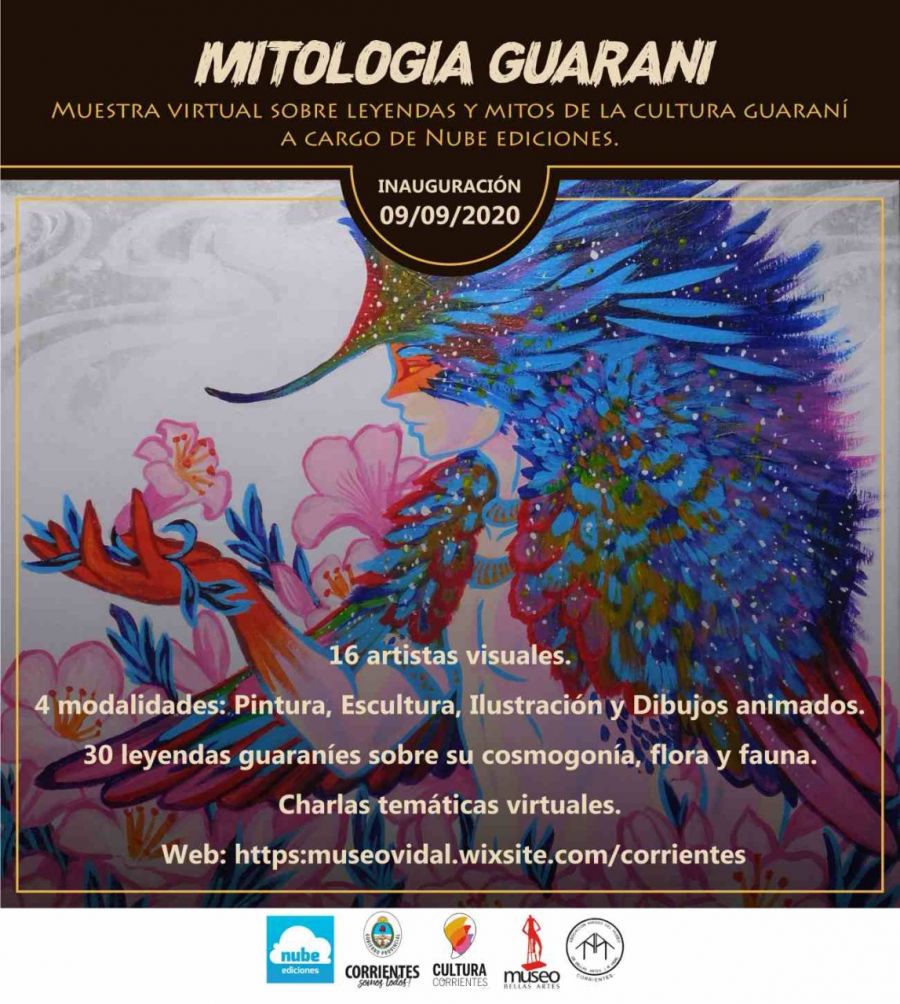 El Instituto de Cultura de la Provincia y el Museo de Bellas Artes "Dr. Juan R. Vidal" junto a Nube Ediciones presentan la muestra virtual MITOLOGIA GUARANÍ que reúne un conjunto de ilustraciones, esculturas, pinturas y animación realizadas por un grupo de diecisiete artistas visuales. Esta exposición quedará habilitada este miércoles 9 de septiembre, a partir de las 19, en la página web del Museo: www.museovidal.wixsite.com/corrientes.