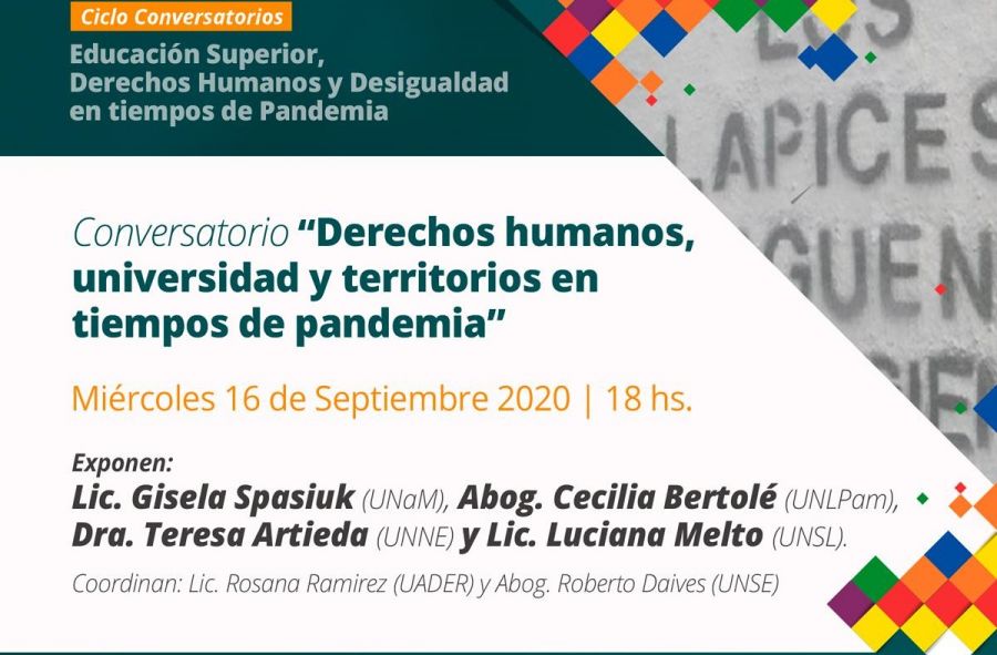 A las 18 hs está previsto el inicio del primer Conversatorio denominado “Derechos humanos, universidad y territorios en tiempos de pandemia” pensado para generar un intercambio reconociendo la presencia de las universidades públicas en los territorios, mitigando los efectos de la pandemia desde el trabajo coordinado con diversos actores sociales e institucionales.