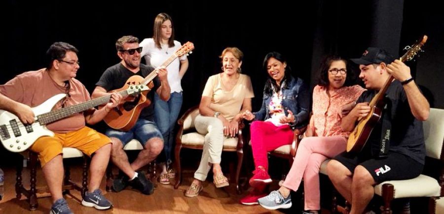 Foto: Ariel Román, Hugo Galeano, Lucía Troitiño, Boni Vera, Mirta Noemí Talavera, Rafaela Vera y Roscer Díaz, en un ensayo de actuación en la Fiesta Nacional del Chamame – enero 2020: ABC Color