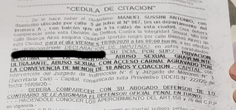 El diario 1588 dio a conocer una cédula de notificación por la cual, Sussini debía presentarse el viernes 18 de septiembre pasado en el juzgado de Instrucción N°6 y el Juzgado de Menores N°3.