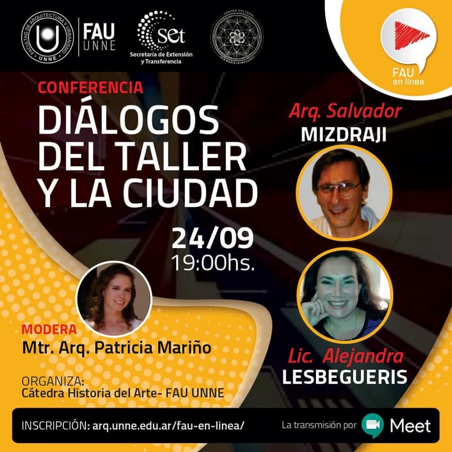 Los artistas visuales, Arq. Salvador Mizdraji y Lic. Alejandra Lesbegueris brindarán este jueves, 24 de septiembre, a las 19 horas, coordinados por la arquitecta Patricia Mariño, una coferencia en "AU en Línea: Diálogos del taller y la ciudad". Organiza la Cátedra Historia del Arte de la Facultad de Arquitectura y Urbanismo -FAU- de la Universidad Nacional del Nordeste -UNNE-
