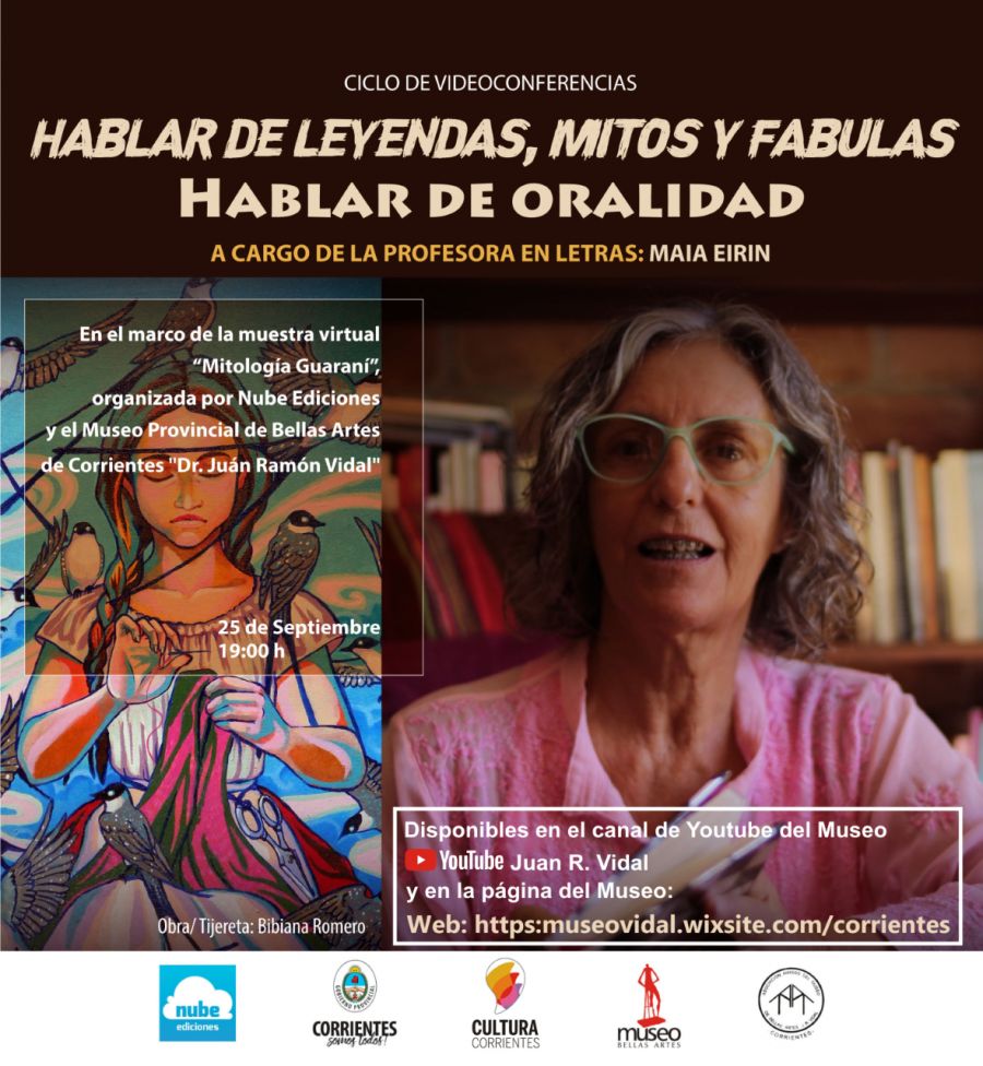 En el marco de la muestra virtual “Mitología guaraní”, organizado por el Museo Provincial de Bellas Artes “Dr. Juan Ramón Vidal” y Nube ediciones, este viernes 25 de septiembre a partir de las 19 estará disponible la segunda de las video conferencias programadas “Hablar de leyendas, mitos y fábulas. Hablar de oralidad”, a cargo de la profesora Maya Eirin