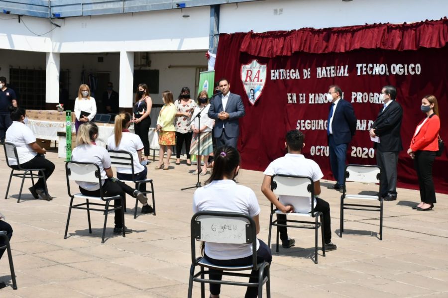 Durante el acto, el gobierno provincial, a través del ministerio de Educación, hizo entrega al mencionado colegio de dos tótems de alcohol en gel por cinco litros y kit de sanitizantes para alumnos, además de tres bases para banderas de ceremonias, como así también una computadora de escritorio completa con impresora láser, para tareas administrativas.