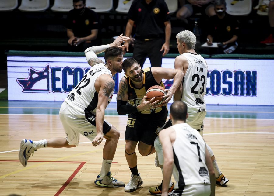 Olímpico se esforzaba por conseguir los puntos en la zona pintada, con Rasio gravitando, sin embargo Comu respondía con triples y el esforzado trabajo de Arn y Fierro en la pintura. A puro triple los dos, Flor empató el juego en 41 cuando el Aurinegro se había puesto al frente nuevamente. El cierre tuvo al equipo santiagueño anotando una vez más de tres y en la última bola Montero sumó dos para terminar el primer tiempo 44 a 43.