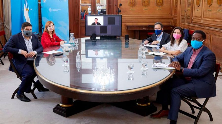 La reuniòn de tres funcionarios del Fondo con la secretaria de Relaciones con las Provincias del ministerio del Interior, Silvina Batakis. A su lado, el argentino Sergio Chodos, representante argentino en el Fondo. Desde la pantalla, en forma virtual, el ministro del Interior, Eduardo de Pedro