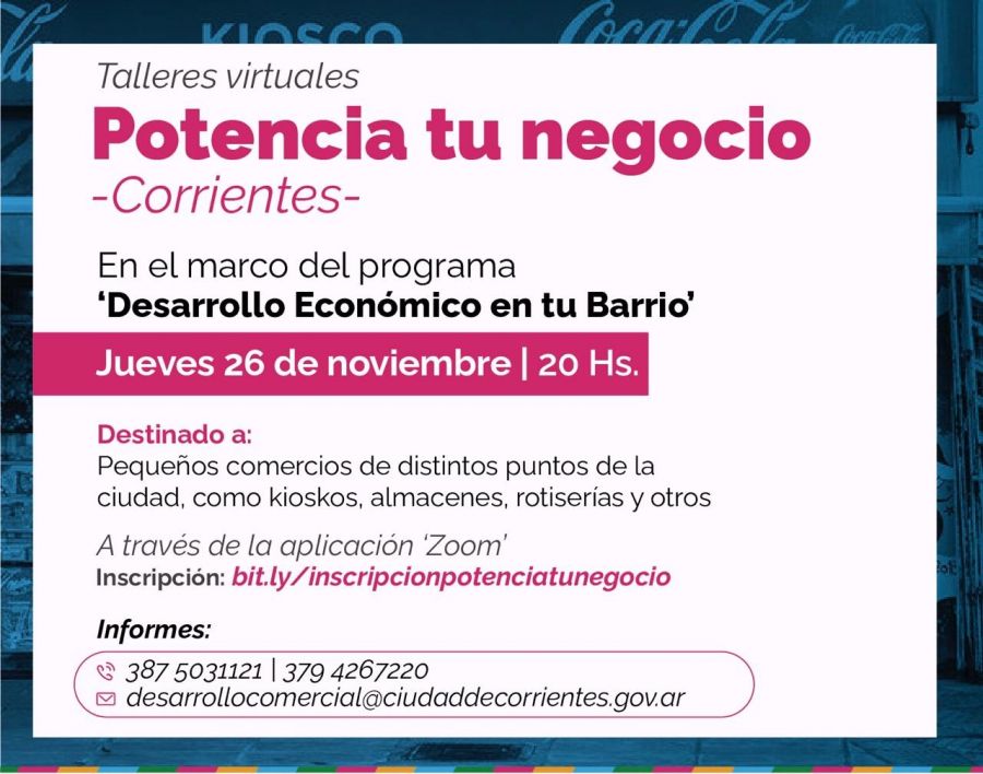 La Municipalidad de Corrientes junto a la empresa Arca Continental y Coca Cola Argentina presentara este jueves a las 20 los talleres de capacitación del Programa “Potenciá tu Negocio”, de la firma. El mismo se realiza en el marco del programa “Desarrollo Económico en tu Barrio”.