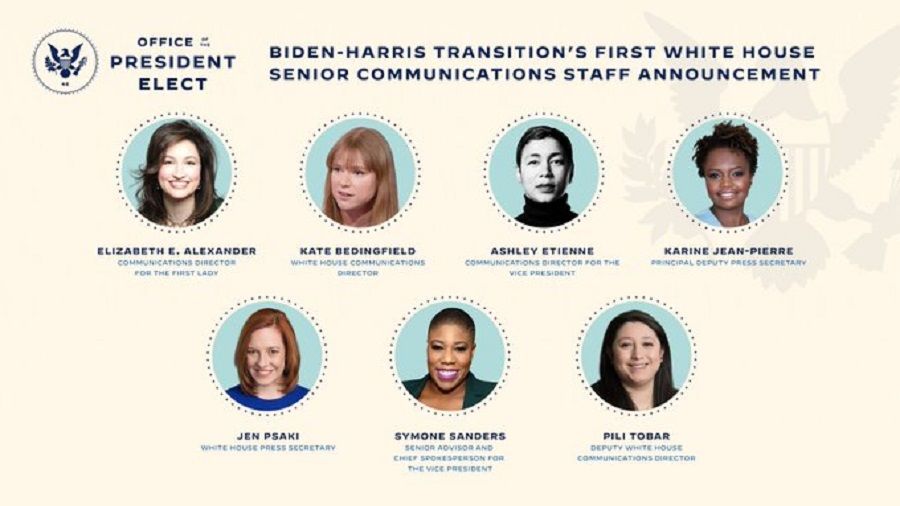 El presidente electo de Estados Unidos, Joe Biden, anunció que el equipo de Comunicaciones de la Casa Blanca estará compuesto exclusivamente por mujeres, por primera vez en la historia del país.