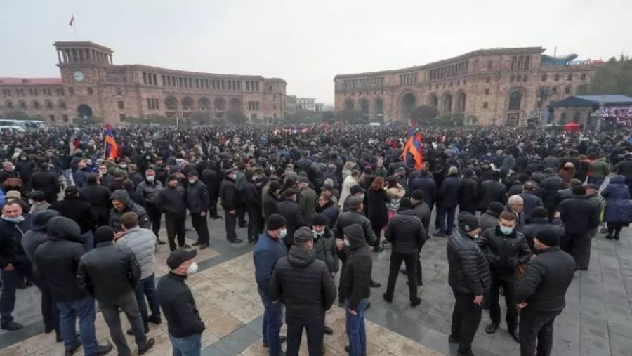 Los manifestantes exigen la dimisión del primer ministro por lo que dicen fue un manejo incorrecto en el conflicto de unas seis semanas en el enclave de Nagorno Karabaj, que dejó al menos 5.000 víctimas fatales y finalizó con una tregua entre Armenia y Azerbaiyán. Un acuerdo mediado por Rusia y rechazado por quienes ahora protestan en Ereván.