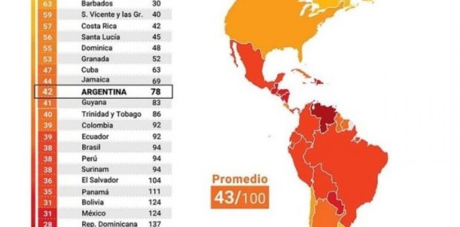 Con los 42 puntos obtenidos el año pasado, el país se encuentra un punto debajo del promedio global (43 puntos), un escalón debajo de Túnez, Vuanatú y Ghana, en el mismo nivel que China, las Islas Salomón, Barhein y Kuwait y un punto arriba de Benín, Lesotho y Guyana.