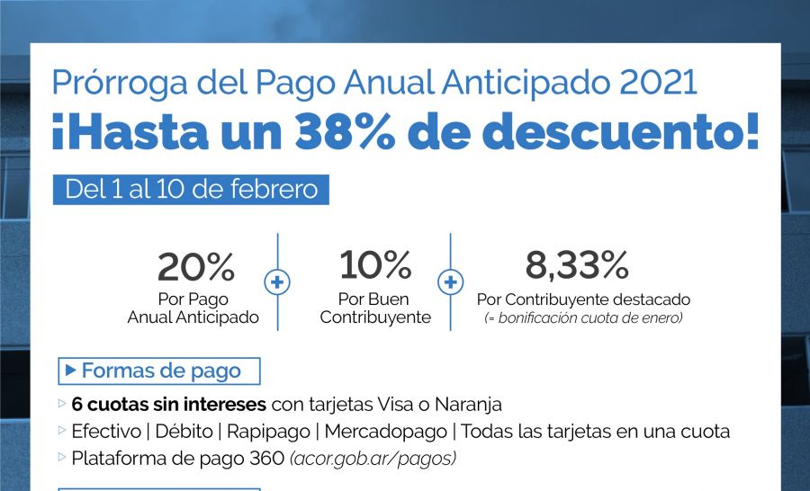 La Municipalidad de Corrientes anunció la prórroga del Pago Anual Anticipado 2021. El plazo, que finalizaba en enero, se extenderá del 1 al 10 de febrero con descuentos de hasta el 38 por ciento en el impuesto automotor y un 23 por ciento en los demás conceptos.