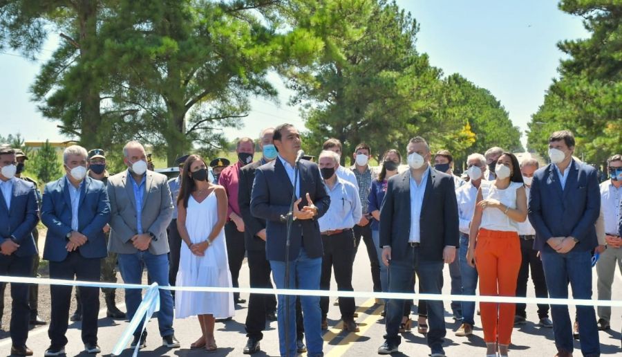 Junto al intendente de la localidad, Miguel Olivieri, Valdés presidió inicialmente la inauguración del refuerzo de calzada y obras complementarias, en el acceso a la ciudad, sobre la mencionada ruta provincial.