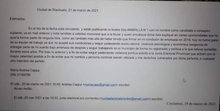 Concretamenre afirma que Jetter la "obligaba" a entregarle el 75% de sus haberes lo que ha puesto en conocimiento de la Junta Electoral del Pro Corrientes. a las actuales autoridades del Pro Nacional, Patricia Bullrich y también el secretario General, Eduardo Macchiavelli.