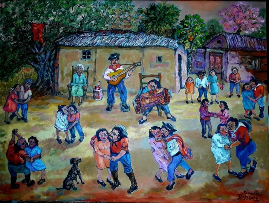 La muestra se encuentra en la Sala “José Negro. Entre las obras expuestas se halla “Chamamé en el Patio”, que el artista dona al patrimonio del Museo, un óleo sobre lienzo de reciente producción con la cual también se suma el artista a la Declaratoria del Chamamé como Patrimonio Cultural Inmaterial de la Humanidad.