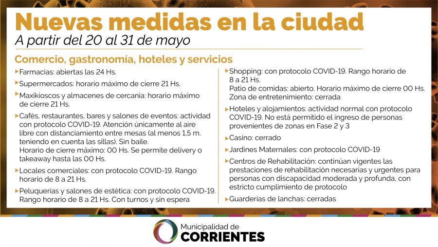 Asimismo, se estableció el “asueto administrativo en el ámbito de la Municipalidad de la Ciudad de Corrientes a partir del 19 de mayo de 2021 y hasta el 31 de mayo de 2021 inclusive, disponiendo la suspensión de todos los plazos administrativos entre las fechas comprendidas”, se indicó.