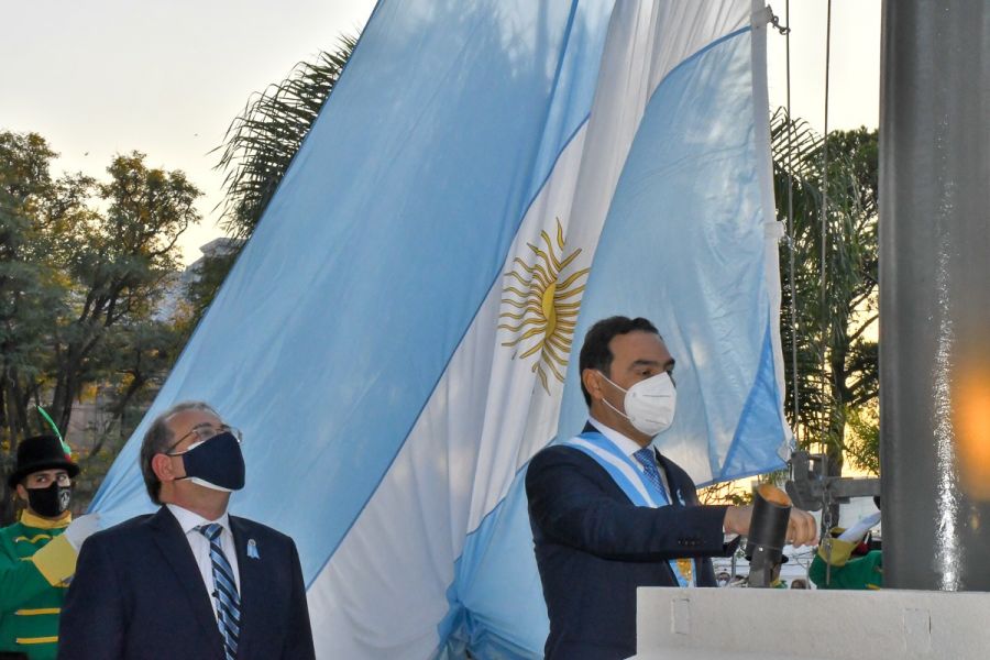 Luego la actividad se trasladó hacia la plaza 25 de Mayo, donde Valdés y Tassano izaron la Bandera con las estrofas del Himno Nacional Argentino de fondo. El acto además contó con ofrendas florales al pie del monumento a San Martín y un minuto de silencio.