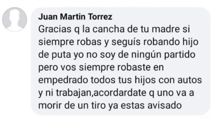 La amenaza fue escrita en el muro personal del intendente en la red social Facebook bajo un posteo de Cheme en agradecimiento a los votantes que es sufragaron en favor de sus propuestas en las elecciones del 29 de agosto pasado.
