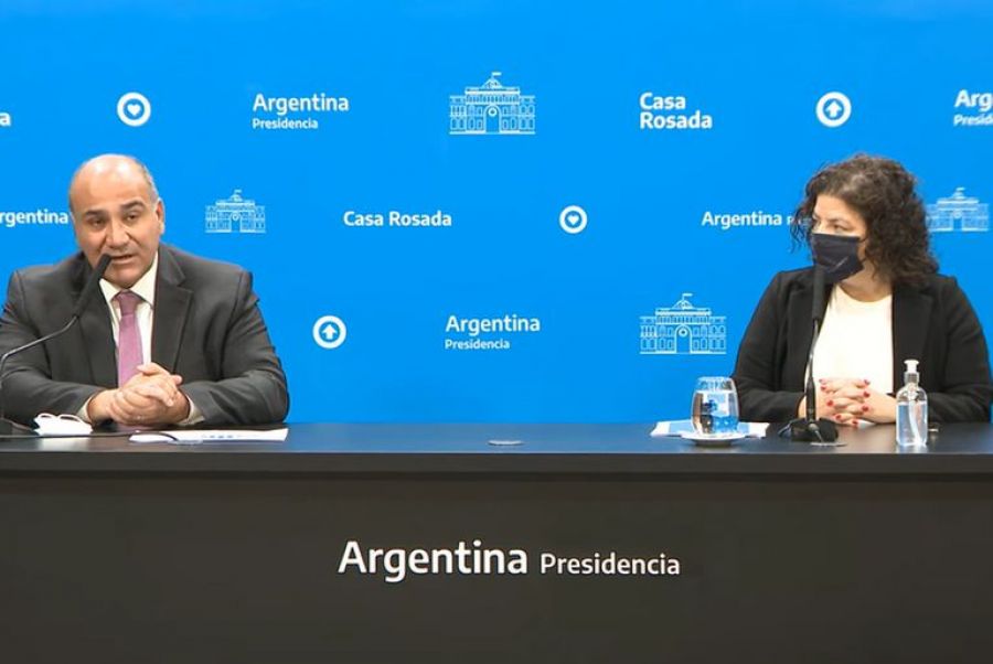 El jefe de Gabinete, Juan Manzur, y la ministra de Salud, Carla Vizzotti, brindan esta martes una conferencia de prensa en Casa Rosada, tras una reunión que mantienen esta mañana, informaron fuentes oficiales